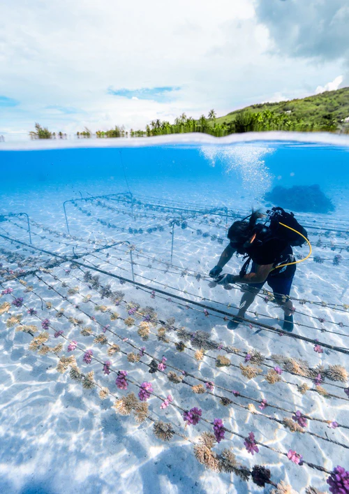 Expand our original gardens in the lagoons of French Polynesia, where we grow resilient corals in rope nurseries that have become bustling ecosystems, brimming with marine life.